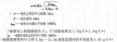 于2010年12月开始施工,施工所用机械为柴油打桩机,机锤重3.2t。当桩管沉入至4.0m时,锤击数已达100余次,且无法继续打入,桩管无法正常拔出,经比对《岩土工程勘察报告》《建筑地基处理技术规范》JGJ79-2002(J200-2002)14.2桩间距宜为桩孔径的2.0~2.5倍,桩间距估算公式: