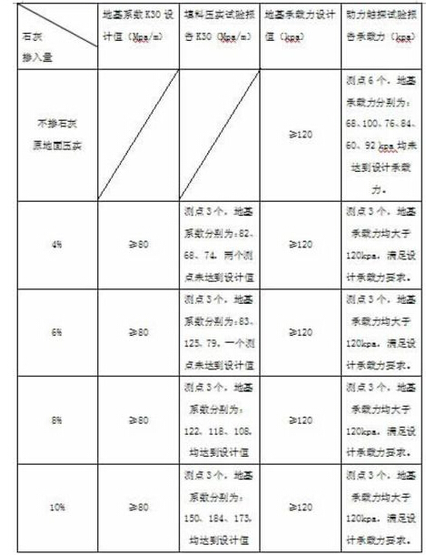 采用石灰改良土进行换填加固,加固深度0.5m(含清除表层后的0.2m),采用路拌法施工。为确定最优石灰掺入量,按照路基填筑压实工艺试验要求,分别按石灰掺入量4%、6%、8%、10%改良土进行摊铺、碾压做试验段,采用地基系数和地基承载力双指标进行试验检测,以确认在满足设计地基承载力情况下最优石灰掺入量。试验报告对比分析见表1所示。