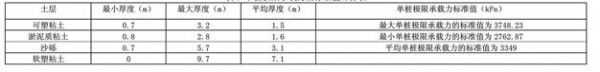 (2)灌注桩法的地基处理技术。灌注桩其实是一种端承桩,所以灌注桩的桩端必须落在持力层中。桩长的决定因素是建筑物对变现和承载力的要求、设备能力以及土质条件等等,根据本施工项目的具体环境条件,桩长为7米到二十一米不等。然后根据施工设备等来决定出灌注桩的桩径,为800毫米;再根据地基的承载力和地基土层特性决定桩距为1.6米;最后进行单桩极限承载力的计算(如表1)