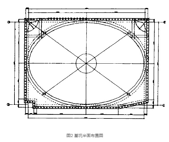 环形内支撑的平面布置可根据基坑的尺寸设计成圆形、椭圆形或其它弧形。截面尺寸宽度为1200~2000mm,高600~lO00mm,全截面配筋,砼强度等级为C30~C40。图1是某工程圆形内支撑布置图。一般来说,基坑侧壁的荷载通过整体现浇板或梁传到环梁上。为了保证环梁的受力合理,在进行结构布置时应尽可能利用板向环梁传递荷载。