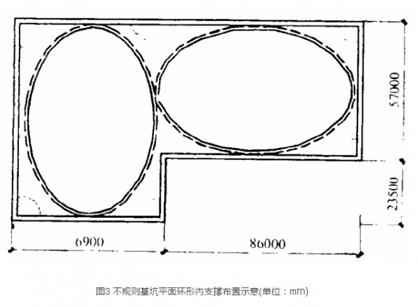对于基坑平面为正方形或近似方形时,可采取圆形内环支撑;对于长方形基坑可采用椭圆形支撑,如图2所示。而对于窄长形或不规则形的基坑,则应采用2个或2个以上圆环或其它曲线进行组合,如图3所示。