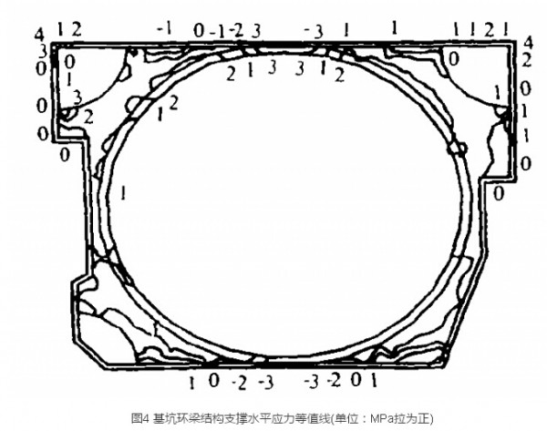 根据监测单位提供的观测资料,环梁的位移最大值约为10mm,这一结果与理论计算值相吻合,亦满足设计要求。