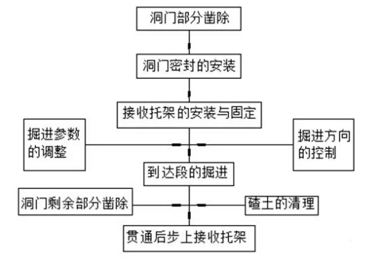 盾构机到达施工是指从盾构机到达下一站(调头井)之前50m到盾构机贯通区间隧道进入车站被推上盾构接收基座的整个施工过程。其工作内容包括:盾构机定位及接收洞门位置复核测量、地层加固、洞门处理、安装洞门圈密封设备、安装接收基座等,到达施工流程盾构到达施工流程图如图图1所示。