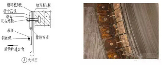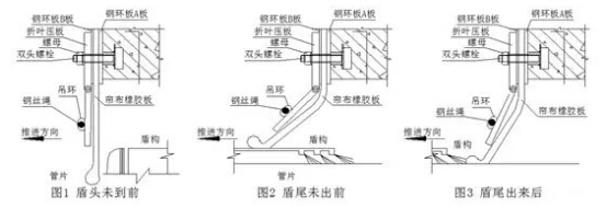 7、当盾构前体盾壳被推出洞门时通过压板卡环上的钢丝绳调整折叶压板使其尽量压紧帘布橡胶板,以防止洞门泥土及浆液漏出。在管片拖出盾尾时再次拉紧钢丝绳,使压板能压紧橡胶帘布,让帘布一直发挥密封作用。其示意图3如下: