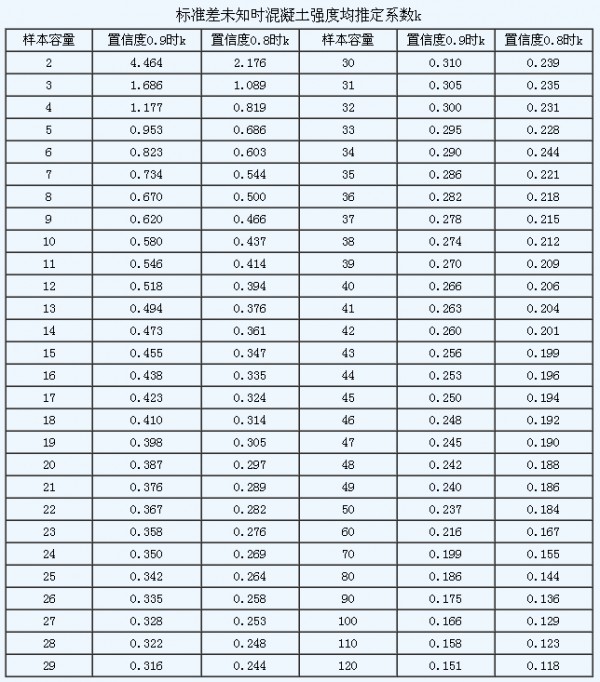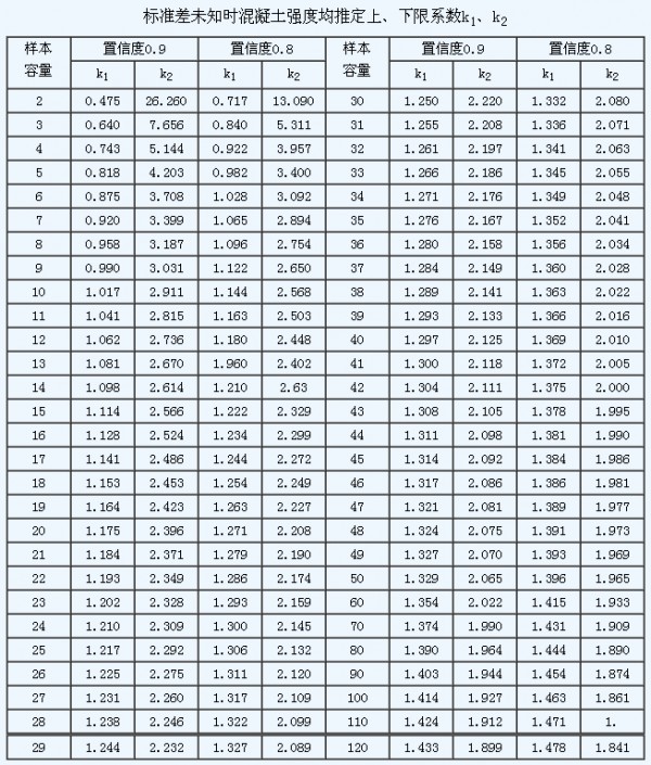 k2-——结构或检验批混凝土强度标准值推定区间上限值系数,当推定区间的置信度为0.90时,取附表二中与样本容量n对应的置信度为0.9一栏的数值,当推定区间的置信度为0.85时,取附表二中与样本容量n对应的置信度为0.8一栏的数值;