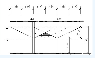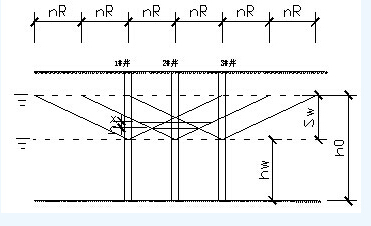 三口群井排成一排,间距S取nR(R为抽水影响半径,n=S/R),中间的那口井的出水量非常接近群井抽水时的单井出水量,因此以此作为群井抽水时的单井出水量理论值。