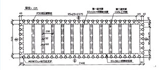 根据地质资料及周围环境,基坑设计为6m×24m的长方形,基坑深8m,支护结构采用排桩,设计为Φ80@950的钻孔桩,桩间布Φ50的高压旋喷桩做防水帷幕。坑内设两道支撑,第一道支撑在距坑顶1m处,采用60cm×60cm的钢筋砼支撑;第二道支撑在距桩顶4m处,采用I32b工字钢。桩顶设置80cm×80cm的圈梁。为保证基坑稳定和控制基坑变形及对邻近公共设施的影响,连续墙内侧被动区土体采用水泥搅拌加固,加固深度为3m,加固宽度为6m,采取块状加固,加固区水泥掺量为15%,水灰比为0.5,以水泥土龄期为30天的强度参数作为计算参数:γ=18kN/m3,内摩擦角25°,粘聚力为200kPa。基坑设计方案见图2和图3。