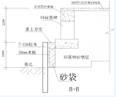 基坑南边靠近鸳江桥和道路,基坑紧靠人行道,人行道下面有约2m的砂垫层,而且沿基坑旁有一旧砖基础和圈梁,采用砂袋+松型桩支护方案。
