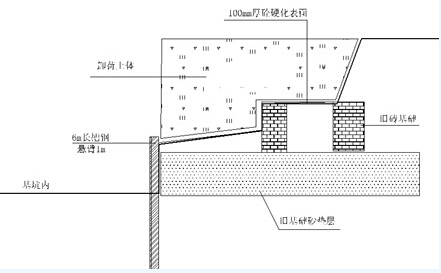 基坑西面靠近文化馆职工楼,距离约7米。根据甲方提供的历史资料,基坑外有两道旧砖基础,砖基础下有50cm砂垫层,砖基础上面是1~3m的杂填松土。采用分级卸荷+槽钢支护的方案。