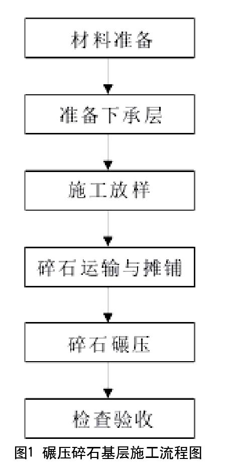 结合工程实践经验,本公路填方或土路基先铺碾压碎石基层,施工完毕后再进行垫层施工。本公路碾压碎石基层施工工艺流程见图1所示。