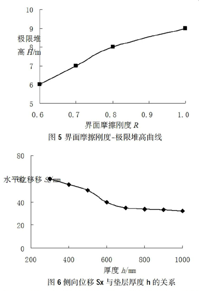 (2)砂垫层与土工格栅间的界面摩擦刚度选择0.8~1.0进行数值分析,对坡脚水平位移影响不大,但随着摩擦刚度的降低,会导致极限堆高的减小。