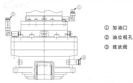 3.卸下排放螺塞和油面塞,让动力头齿轮油排放到一个适当的容器内,排放过程中可适当缓慢转动动力头齿轮,以便于放油和排净污染物,但此时应注意安全,齿轮转动时相关人员应远离现场。