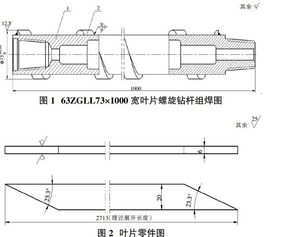 目前重庆院设计的宽叶片螺旋钻杆外径尺寸为Φ73、Φ89,长度尺寸为550、600、800、1000、1500。以使用量最大的63ZGLL73×1000宽叶片螺旋钻杆为例,进行具体的加工工艺技术研究。63ZGLL73×1000宽叶片螺旋钻杆由63ZG1000光钻杆在外圆绕制了螺旋叶片,通过双面焊将螺旋叶片与钻杆固定,其设计图样见图1。