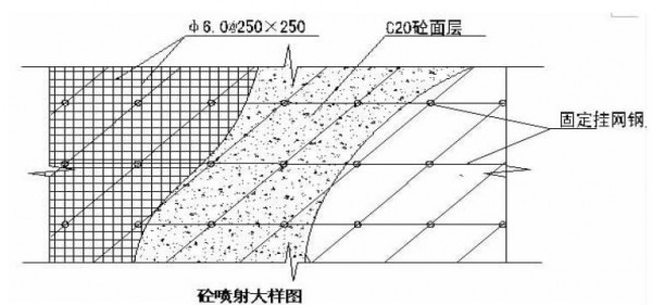 a.铺设、绑扎面层钢筋网,钢筋网采用φ6.5㎜钢筋,间距为250㎜×250㎜。挂网时间应在注浆4h后进行。