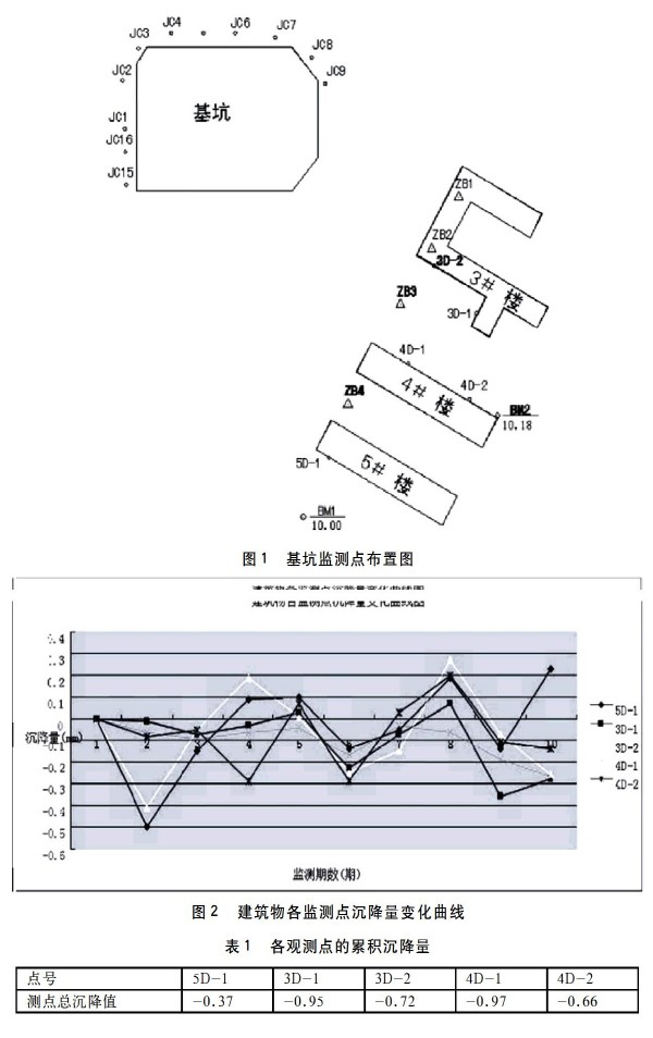 基坑监测工作于2009年6月17日开始布点,总计观测20次。在基坑上布设变形监测点,平面位置上力求对称,做到全面监测,突出重点。监测项目主要是对基坑旁3号、4号、5号楼进行沉降监测。本次共布设监测基点5个(ZB1、ZB2、ZB3、ZB4、BM1),水平位移监测点9个(全为基坑边监测点,编号为JC1~JC9,间距约20m,距基坑边线约0.2m),沉降监测点16个(11个水平位移监测点同时作为沉降监测点,建筑物沉降观测点为5个,编号为3D-1、3D-2、4D-1、4D-2、5D-1),点位详见基坑监测布点图1。6月19日对监测点进行了初始数据的观测,初次观测独立观测两次,取其平均值作为初始数据,并对基点进行了联测。在基坑开挖过程中,每3天~4天进行一次观测,若沉降观测点的沉降量出现异常,则对各观测点进行加密观测[5]。