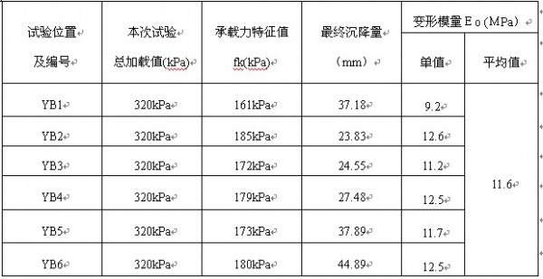 从检测结果看,YB2、YB6承载力特征值均超过180kPa,最小值只有161kPa,最大值只有185kPa,平均值有175kPa。最终沉降量最小值只有23.83mm,最大值只有44.89mm,平均值有32.64mm。变形模量Eo最小值只有9.2MPa,最大值12.6MPa,平均值有11.6MPa。从承载力特征值、最终沉降量、变形模量看,该强夯地基是不均匀的,但上述参数满足作为该建筑物地基承载力和沉降的要求。另外本次荷载摘的受荷面积只有0.50m2,比较小,加荷后影响的深度不会超过2倍承压的直径,而且加荷时间比较短,因此不能提供通过荷载板试验提供建筑物长期沉降的资料;当表层事浅层有一层“硬壳层”时,当采用小尺寸的承压板时,常常受压范围还在“硬壳层”内,其下软弱土层还未受到承压板的影响,而对于实际建筑物的大尺寸基础,下部软弱土层对建筑物沉降起主要的影响。因为时间及试验的原因本次平板载荷试验只做了6个点。
