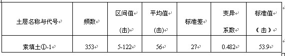 场地内共布置轻探试验点40个。轻探试验锤击数统计如下表4,其承载力特征值为164kPa。