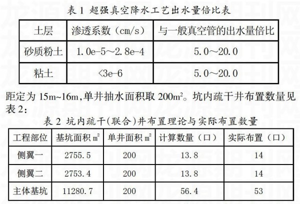 本工程采用的超强真空降水技术(SVD)弥补了一般的真空管井真空度难以保证的缺陷。该技术采用特殊的分离式气密性滤水管结构,形成高于0.08MPa的持续性负压真空,同时,在地下工程施工过程中,无论降水井如何暴露,内管始终处于密封状体,可以始终保持高真空度的负压真空。根据试验与实践统计,采用超强真空降水工艺后,不同的土层中单井出水量都有较大幅度的提高,特别是粘土地层提高的效果更显著,具体效果比较可见表1。
