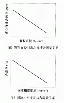 在分离过程中,颗粒沉降速度VR越大,分离效果越显著;颗粒直径愈小,沉降速度愈慢,愈难分离,离心母液中的含固量也相应增加,反之,颗粒直径愈大,沉降速度愈快,越易分离,离心母液含固量越少,如图3所示。固液相密度差的增大,颗粒沉降速度VR越大,分离效果越显著,滤饼含湿量越少,如图4所示。悬浮液黏度取决于液相黏度和悬浮液的浓度,黏度越小,颗粒沉降速度VR越大,分离效果越显著;由下式判断: