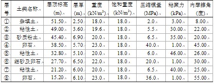 中冠大厦工程位于北京海淀区海淀南街北侧,大厦地上13层,地下3层,地面标高约52.4m,基底埋深-16.05m,基坑开挖深度为-16.15m。东侧约10m处为已完成新中关大厦,其基础埋深约20m,其基坑采用护坡加锚索支护;其余各侧均为马路。另西侧距离红线1m左右(局部至红线)有高压线和电信线。根据勘察资料,场地地层构成及土层参数见表1,钻探40.0m深度范围内存在3层地下水见表2。