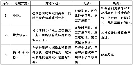 根据以往工程经验,并结合缺桩附近的周围环境,初步选定的处理方案有:重新补桩、增大承台、锚杆桩补桩等,通过可行性分析和经济技术对比最终确定处理方案。