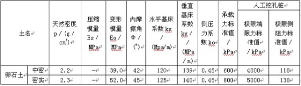 岩土物理力学参数的选定,是在土工试验、动探试验的基础上。设计参数的建议值如表1所示。