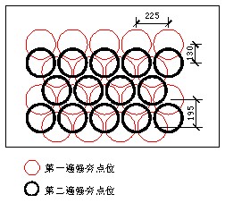 施工时按先低后高,先中央后两侧卸料的原则安排好石料运送路线。当石块级配较差,粒径较大,填层较厚,石块间的空隙较大时,在每层表面的空隙里扫入石渣、石屑、中砂、粗砂再以压力水将砂冲入下部,反复数次,使空隙填满。对于岩石强度相差较大的石料,要分层或分段填筑。边坡外侧1m内须人工垒砌,在此范围内选择有平整面的大块石人工排砌,垒砌石料粒径必须大于25cm。当地面纵、横坡度大于5:1时,地面必须挖2m宽内向横坡为2%的台阶,坡脚处用石料垒成石垛。夯实路线对夯锤应成弧形,当夯实密实程度达到要求后,再向后移动一夯锤位置。强夯时从中间向两旁进行,夯锤直径为210cm,首遍各夯位宜紧密,如有间隙,则不得大于15cm;次遍夯位应压在首遍夯位的缝隙上,最后两击沉降量相差不大于5cm。经对试验路段研究总结定出强夯夯点布置方案如下图。