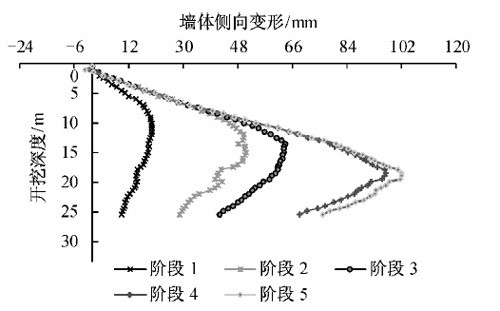 图2墙体测斜点ZQT20随基坑开挖深度变化曲线