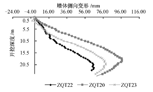 墙体测斜点ZQT22,ZQT23有效测斜深度分别为23.0,24.5m,测得ZQT20,ZQT22,ZQT23在开挖即将完成时的变形曲线如图3所示。