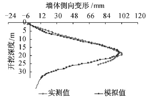 根据图6的模拟曲线和实测曲线的对比,可以认为该软件能够较好地模拟常府街基坑地下连续墙的变形情况。