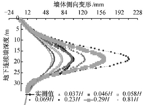 由图7可以看出,不同的围护厚度对最大变形有着显著的影响,以墙体侧向变形为y轴,地下连续墙深度为x轴,整个曲线走势类似正态分布的概率密度函数f(x),对称轴约为u=aH,其中a为开挖深度修正系数,根据不同工程地质取0.8~1.2倍的开挖深度H,常府街站的a=1.1。增加围护结构的厚度对最大变形位置没有影响,最大变形位置几乎处于同一深度,也几乎收缩在同一位置,但随着厚度增加,最大变形一直以不同的程度在减小。