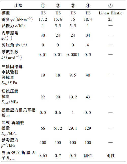 用PLAXIS根据地质勘探的土层数据,将薄层土层或参数相近的土层进行合并以简化土层分布,土层分布以及土体参数如表1所示,设置模拟类型为平面应变,根据平面应变的假设,ZQT20测点所在位置较符合,故本次模拟结果用来拟合ZQT20测斜曲线。本次模拟,土体采用HS本构模型,地下连续墙采用弹性模型。由于接触面的强度参数一般要低于与其相连的土体强度参数,该软件考虑用一个折减系数Rinter来描述接触面强度参数与所在土层的摩擦角和黏聚力之间的关系,各土层的接触面参数Rinter亦在表1中给出。