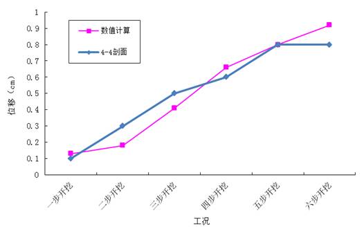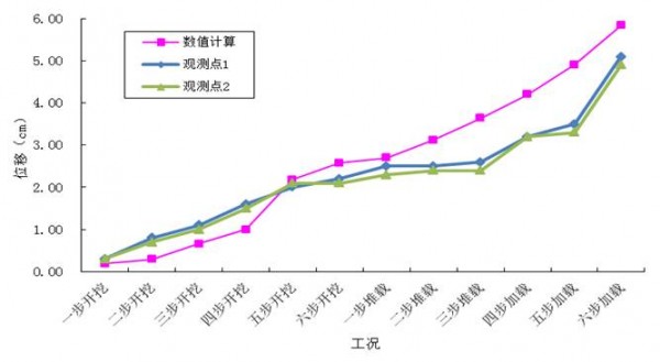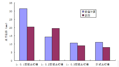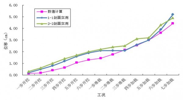 1、随着基坑的开挖,基坑顶部水平位移及基坑后部土体的水平位移逐步增大。基坑开挖过程中水平位移最大点位于基坑面层的顶部,土钉墙坡体的水平位移近似为绕坡底向基坑方向的转动;在基坑加载的过程中,基坑最大水平位移点沿着坡面向下转移。