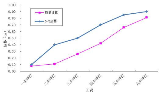 第五排土钉开挖、加载过程中的土钉水平位移分布图