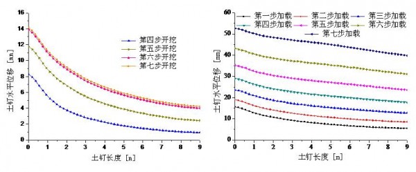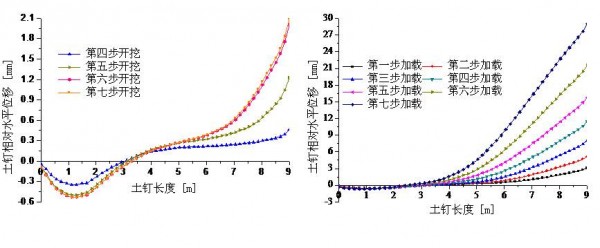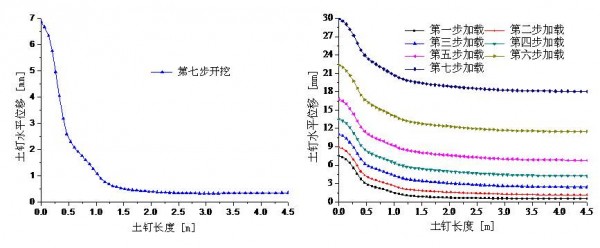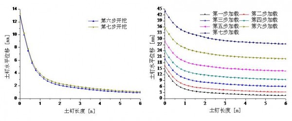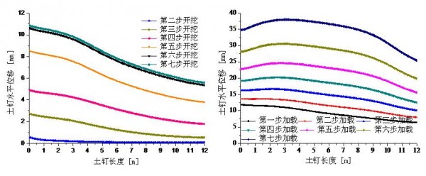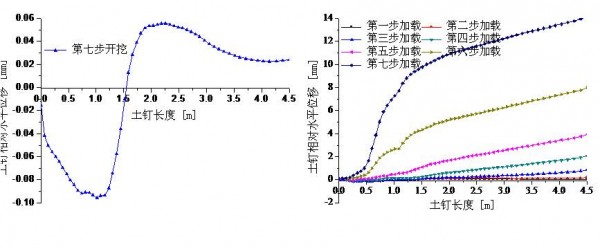 第一排土钉开挖、加载过程中的土钉水平位移分布图