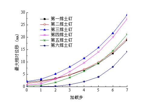 土钉末端与土体的最大相对位移随加载过程的变化曲线