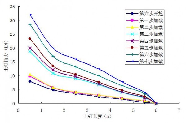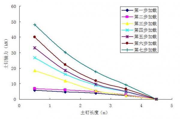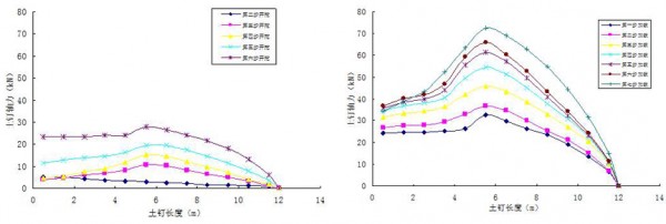 2、随着土方的开挖,基坑上部的几排土钉最大轴力作用点迅速向土钉中部某一位置转移,土钉轴力沿土钉长度呈现中间大、两端小的形态。基坑下部的土钉,其轴力分布形态为土钉头部大、向尾部逐渐递减。