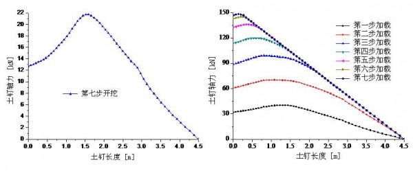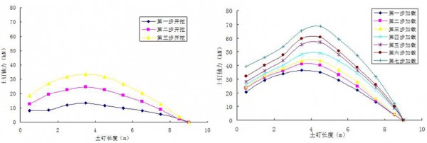 第一排土钉开挖、加载过程中的土钉轴力分布图