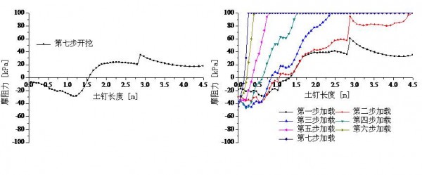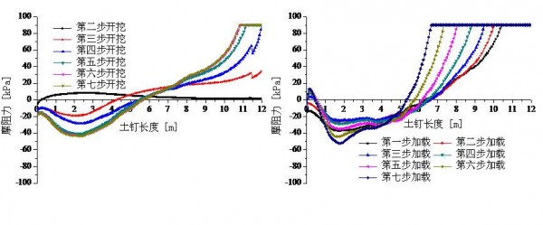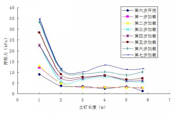 第一排土钉开挖、加载过程中的土钉摩阻力分布图