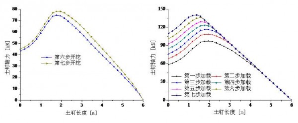 第六排土钉开挖、加载过程中的土钉轴力分布图