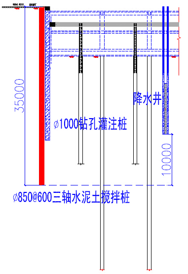 •南半部分:悬挂三轴水泥土搅拌桩隔水帷幕