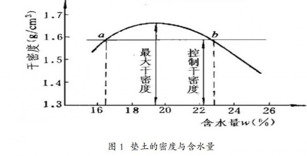 图1所表明的击实曲线,最大干密度为1.65g/cm3,取压实度为96%,则控制干密度为1.58g/cm3。控制干密度的坐标线与击实曲线相交于a,b点,a点的横坐标即为施工含水量的下限值,b点的横坐标为上限值;ab区间即施工控制含水量的范围。若土料的含水量不在该区间内,则密实度是很难达到预期效果的。