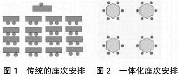 (3)学生参与式教学。在完成教师给的任务时,为了锻炼学生的合作精神,课题以小组的形式进行。座次安排也是以六边桌(如图2所示),而不像以前那样传统的座次安排(如图1所示)。小组形式的教学便于学生讨论问题,教师在中间也可以随时指导学生解决遇到的问题,而且还能观察学生讨论的状况。