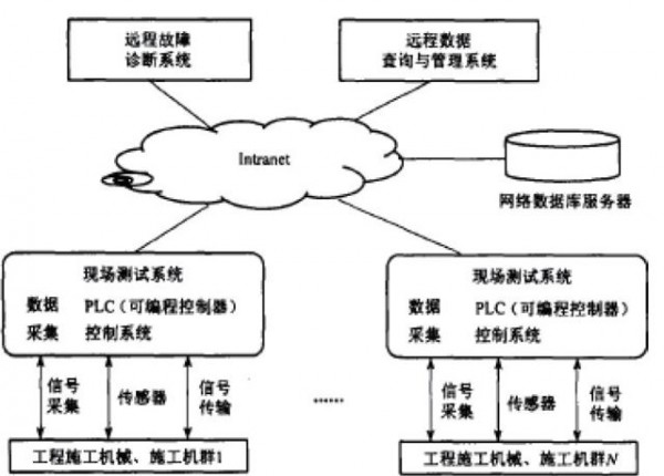 现代大规模基础设施建设是由多品种、多数量工程施工机械、施工机群协同作业的生产过程。施工企业在追求效率和施工成本的基础上,对设备运行的安全性、可靠性提出了越来越高的要求。现有工程机械故障诊断方法,比如电子监测器方式、便携式微机的形式、工程机械检测维修车方式等,虽然在一定程度上解决故障问题,且不能实现管理者对设备状态的在线监视,现场管理者缺乏机群设备状态的第一手资料,难以实现对施工机群进行科学的管理和实时调度。因此有必要寻找一种经济、可靠、易实现的方法来实时地监测施工机械的运行状态,及时发现故障,及时处理,保证施工有效地进行。而基于网络的智能故障诊断系统则是以工程机械机群为主要研究对象,结合工程机械施工机群的施工特点和单机设备的结构特点,通过网络对施工机群实施在线状态监测与故障诊断,判断故障原因,提供维修处理意见;评定故障类型及故障严重程度,为机群设备状态分析提供依据;预测停机维修时间,为机群动态施工调度提供依据。系统的基本结构可(如图所示)。