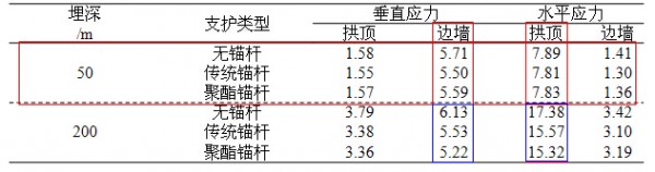 •当埋深为200m时,与无锚杆支护相比,边墙垂直应力减小了14.8%,拱顶水平应力减小了11.9%。说明聚酯锚杆能有效地改善衬砌受力状态,减小应力集中。