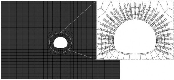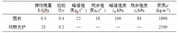 某山岭隧道是双洞双向行驶分离式隧道,全长430m,埋深为68.4m,属于浅埋公路隧道。围岩为中风化玄武岩,岩石破碎,裂隙较发育,属于V级围岩,并表现出应变软化特性。隧道衬砌内轮廓采用半径为5.5m的单心圆,单洞净宽10.5m,净高5.0m