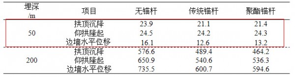 •当埋深为50m时,施作锚杆能有效地限制边墙水平位移。由于聚酯锚杆弹性模量较小,且此时杆体均未屈服,故其拱顶沉降、仰拱隆起、边墙水平位移略大于传统锚杆。