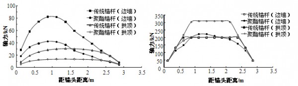 •当埋深为50m时,边墙处锚杆的受力较拱顶处大,传统锚杆的受力较聚酯锚杆大,且轴力都远远小于自身的抗拉强度。
