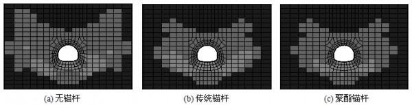 •围岩在无锚杆支护、传统锚杆支护和聚酯锚杆支护三种情况下的塑性区面积分别是2128.58m2、1555.5m2、1517.1m2,施作聚酯锚杆后,围岩塑性区面积较传统锚杆支护减小2.7%,较无锚杆支护减小28.7%,说明聚酯锚杆较传统锚杆更好地限制围岩塑性区的发展。
