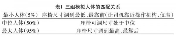 操纵舒适度显著提升,归功于人机工程学的成功运用:人机工程学是研究人、机械及其工作环境之间相互作用的边缘学科,用以设计使操作者能发挥最大效能的机械、仪器和控制装置,并研究控制台上各个仪表的最适合位置。全球各类人种的身高、手脚长度千差万别,如何设计一种绝大多数司机都能舒适操纵的工作环境,是设计者追求的最高目标之一。我国目前还在有效沿用的《GB10000-88中国成年人人体尺寸》为近30年前的中国人口测量数据,已经跟不上时代的需求。当前在国内的设计师大量参照引用的还有国外流行的一些人体尺寸标准及三维数据库,如:Manikin。依靠模拟人体提供的尺寸参考及相关标准,我们在设计时可以基本确定定踏板、座椅、操纵杆、仪表台的准确位置,以满足绝大多数司机的舒适操纵要求。在三维技术已经非常普及运用的今天,我们通常设计的步骤如下:①首先确定三个基准人体尺寸:最小人体尺寸(5%)、中位人体尺寸(50%)、最大人体尺寸(95%)。②根据《GB/T8591-2000土方机械司机座椅标定点》,可以确定司机座椅的SIP点,这个在设计时将与模拟人的SIP点重合装配。需要强调的一点是,通常使用的座椅在高度、前后(甚至左右、坐面角度)都是可调的,与不同位人体对接匹配的应该是座椅处于上述尺寸中间位置的状态。三组模拟人体的匹配关系见表1: